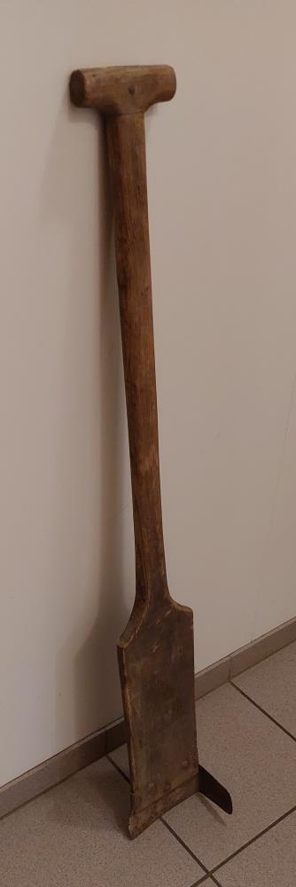 Mótökuspaði, til að stinga upp mó. Spaðinn er úr viði nema blaðið sem er úr járni (mikið ryðgað nú), um 14-15 cm breitt og hæð að utan 10 cm og að innan 4 cm. Járnið/blaðið er fest við viðinn öðru megin með þremur hnoðum. Stigið gengur út úr blaðinu og er um 6 cm á hæð og 8,5 cm á breidd. Efst er handfang 11 cm, en lengd pálsins alls er 107 cm.