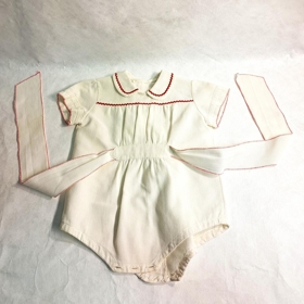 Hvít heimasaumuð barnasamfella (úr Everglaze efni?). Sikksakkað er með rauðum þræði á köntum beltis og ermum. Þrjár hvítar tölur i klofi. Rauður skrautborði á kraga (legging).