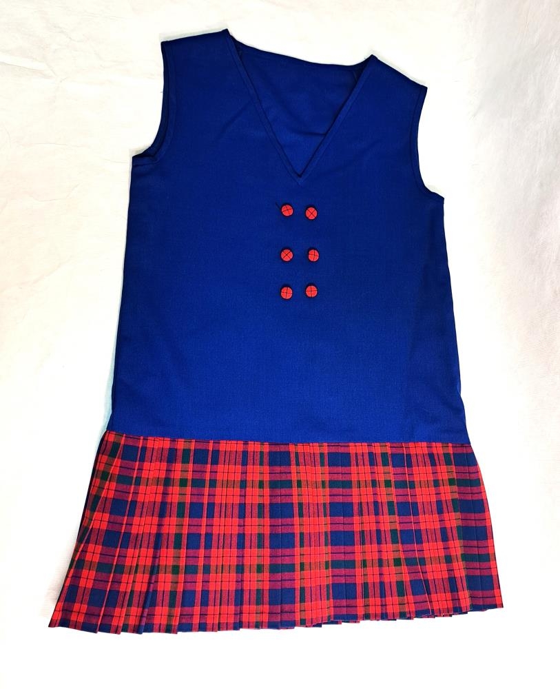 Kóngablár ermalaus sparikjóll. Sex tölur framaná með sama köflótta efninu strekkt á og er í pilsinu sem er plíserað.