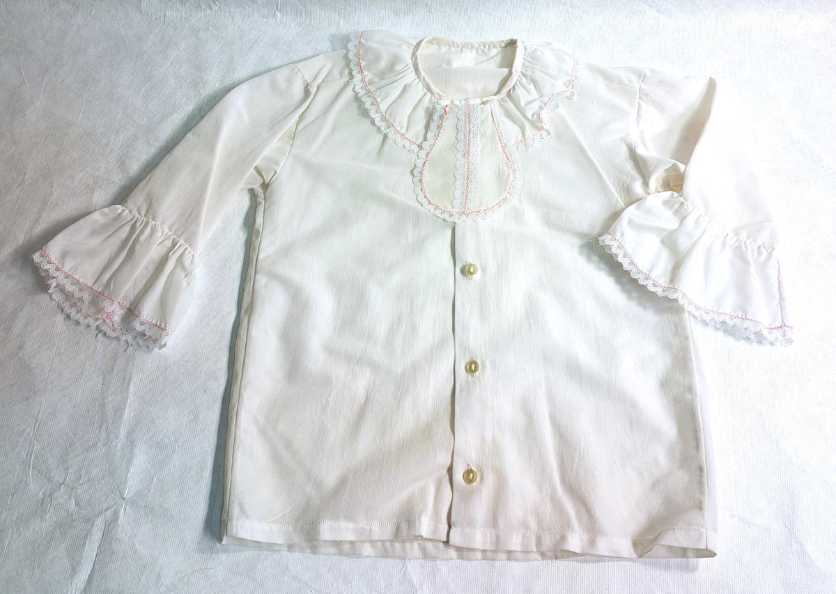 Hvít spari barnaskyrta. Blúndur á ermum og kraga. Skreytt með bleiku sikksakk spori á kraga og ermum. Smella undir kragaskrauti og fjórar plasttölur þar fyrir neðan.