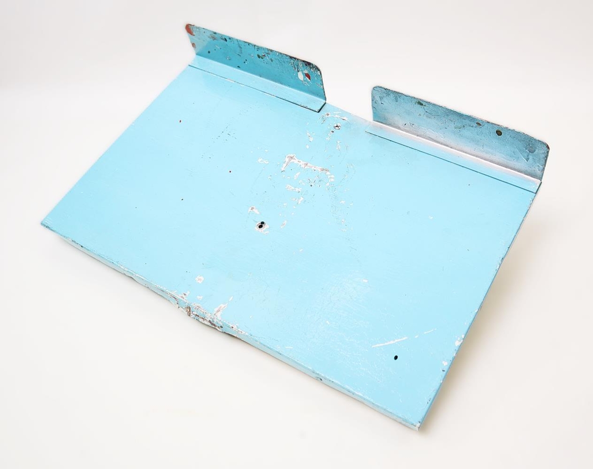 Ljósblár standur úr járni sem var notaður fyrir litaspjaldabækur í verslun og verkstæði Hrafns Jónssonar, Brautarholti 22, Reykjavík - verslun með varahluti í bíla.