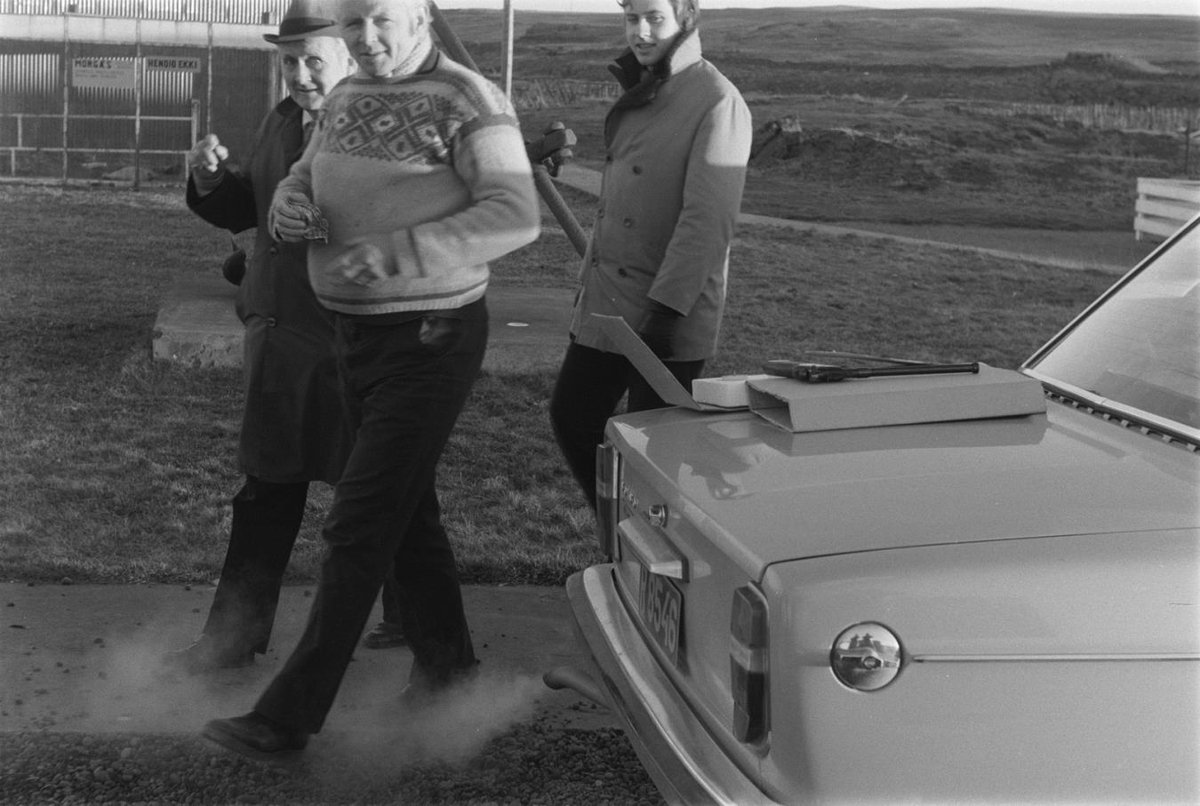 Jón Kr. Gunnarsson forstöðumaður og tveir aðrir ganga frá bíl þar sem deyfibyssan liggur á húddinu.