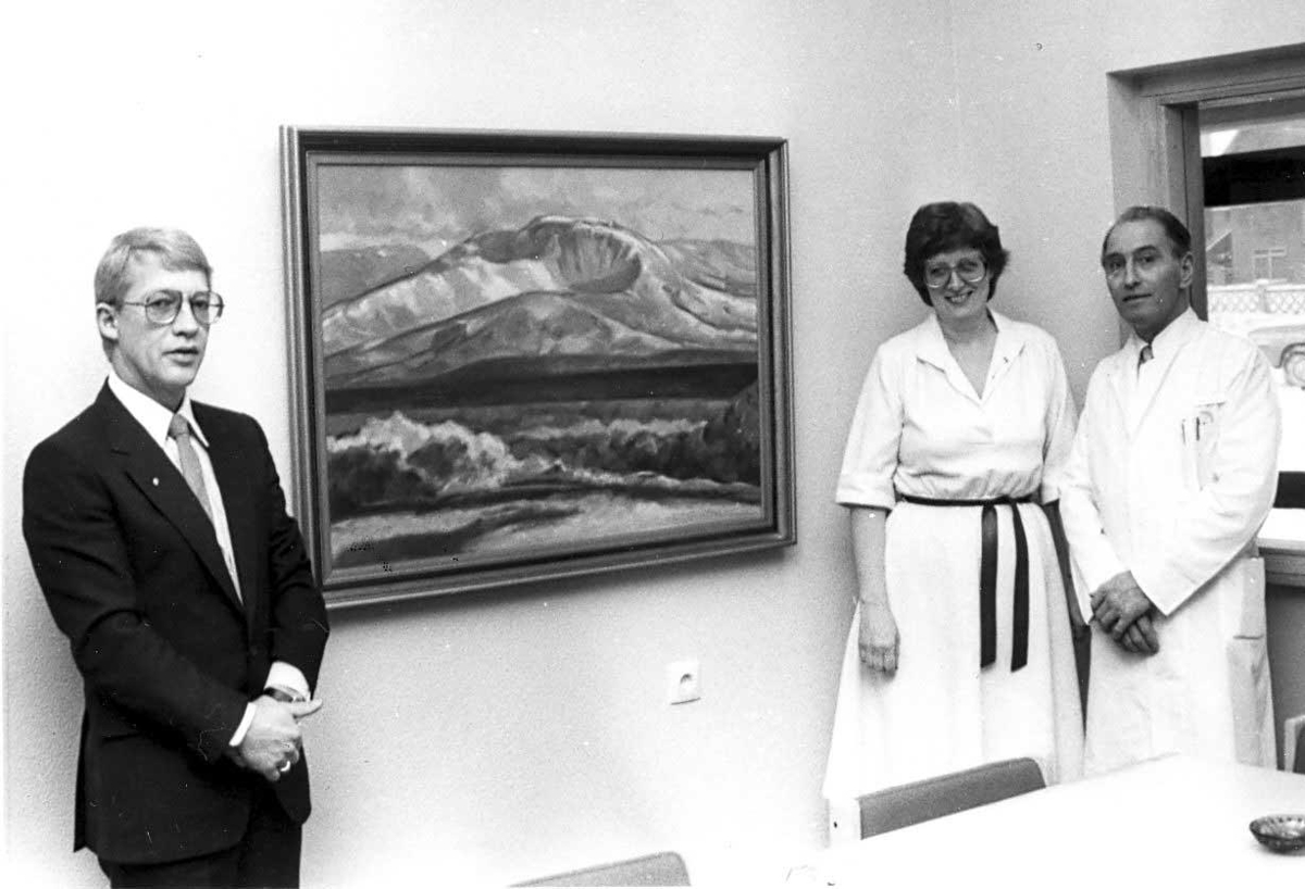 Sjúkrahús Suðurnesja fær málverk að gjöf. Steinþór Júlíusson, bæjarstjórí, NN og Kristján Sigurðsson, sjúkrahúslæknir.