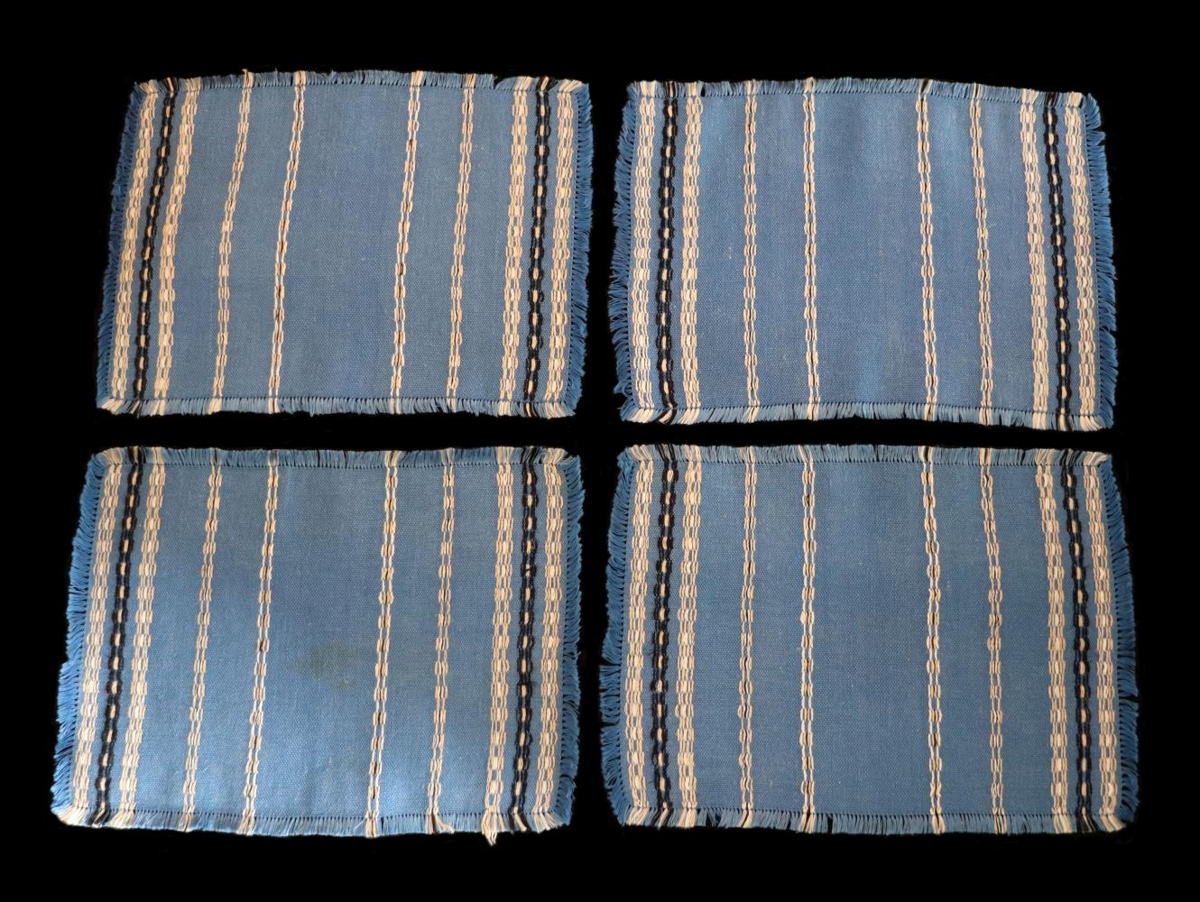 Servíettur 4 stk.: Bláar með hvítum og svörtum röndum. Stærð 23X33 cm. Unnið af nemanda skólans 1961-1962, Elínu Magnúsdóttur frá Birkihlíð í Reykholtsdal.