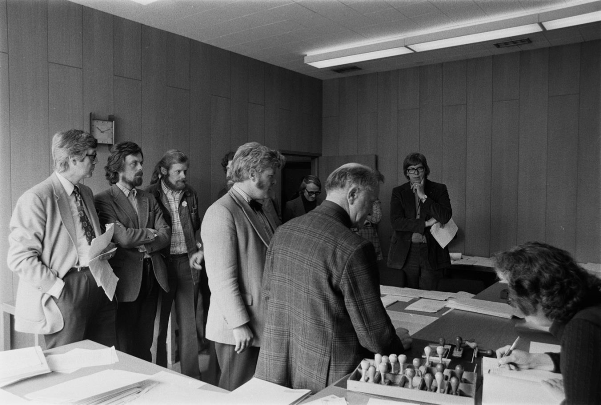 Verið að þingfesta stefnur frá forsvarsmönnum undirskriftasöfnunar sem kallaðist Varið land og snérist um að verja og styðja hersetu Bandaríkjamanna á Íslandi. Af þessu urðu harðvítug blaðaskrif og voru höfðuð mál á hendur 11 mönnum fyrir meiðyrði. Myndirnar eru teknar þegar þeir mæta fyrir borgardóm Reykjavíkur, í Bæjarþingsalnum við Túngötu. Þann 26. júní mættu Garðar Viborg ábyrgðarmaður vikublaðsins Nýtt land og Rúnar Ármann Arthursson fyrrverandi ritstjóri Stúdentablaðsins. Þann 27. júní mættu í dóminn Svavar Gestsson, ritstjóri Þjóðviljans, blaðamennirnir Úlfar Þormóðsson, Hjalti Kristgeirsson og Dagur Þorleifsson, Einar Bragi rithöfundur, Árni Björnsson þjóðháttafræðingur, Helgi Sæmundsson ritstjóri og Gestur Guðmundsson ritstjóri Stúdentablaðsins. Heimild: Þjóðviljinn 26. júní 1974.