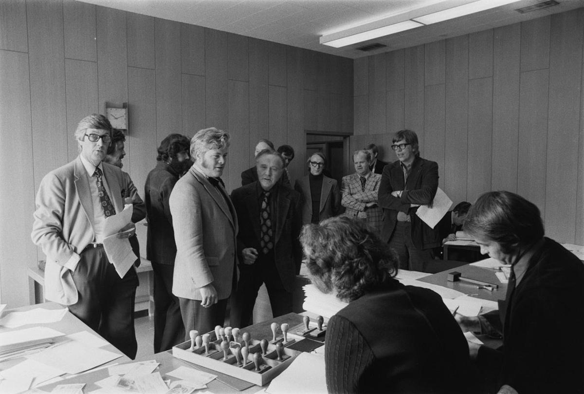 Verið að þingfesta stefnur frá forsvarsmönnum undirskriftasöfnunar sem kallaðist Varið land og snérist um að verja og styðja hersetu Bandaríkjamanna á Íslandi. Af þessu urðu harðvítug blaðaskrif og voru höfðuð mál á hendur 11 mönnum fyrir meiðyrði. Myndirnar eru teknar þegar þeir mæta fyrir borgardóm Reykjavíkur, í Bæjarþingsalnum við Túngötu. Þann 26. júní mættu Garðar Viborg ábyrgðarmaður vikublaðsins Nýtt land og Rúnar Ármann Arthursson fyrrverandi ritstjóri Stúdentablaðsins. Þann 27. júní mættu í dóminn Svavar Gestsson, ritstjóri Þjóðviljans, blaðamennirnir Úlfar Þormóðsson, Hjalti Kristgeirsson og Dagur Þorleifsson, Einar Bragi rithöfundur, Árni Björnsson þjóðháttafræðingur, Helgi Sæmundsson ritstjóri og Gestur Guðmundsson ritstjóri Stúdentablaðsins. Heimild: Þjóðviljinn 26. júní 1974.