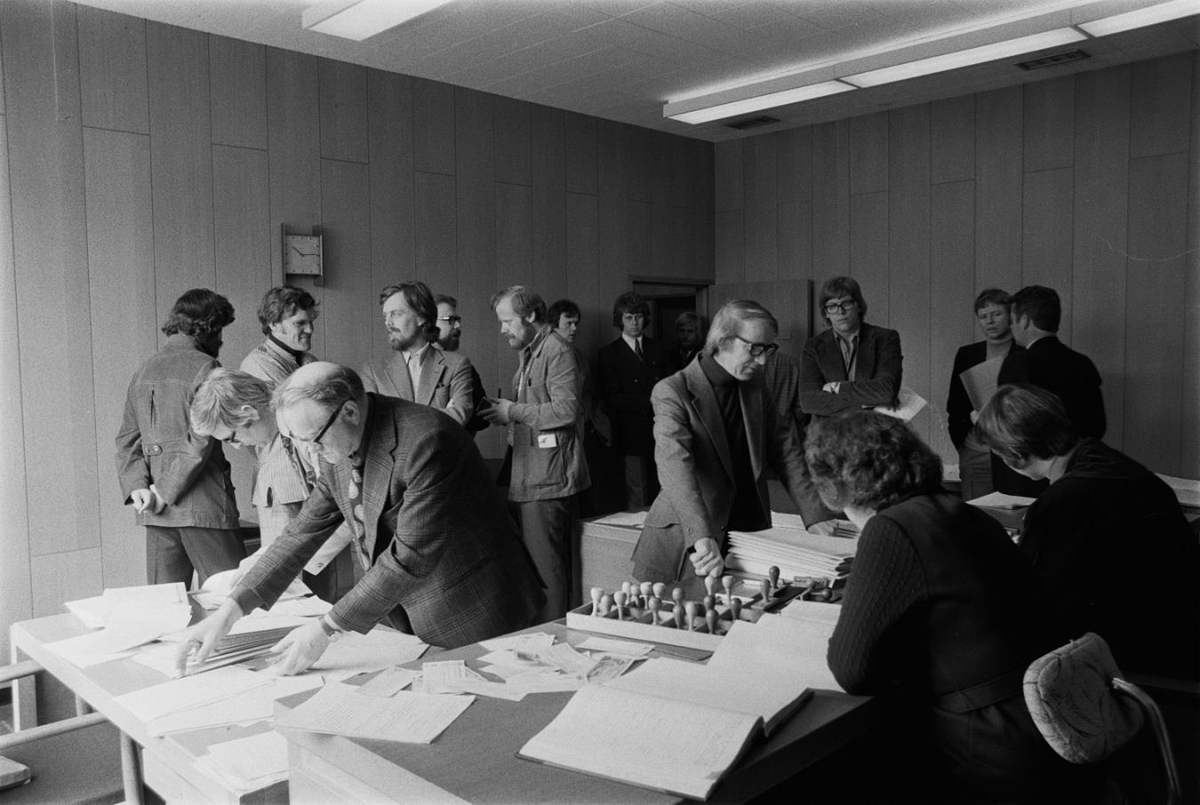 Verið að þingfesta stefnur frá forsvarsmönnum undirskriftasöfnunar sem kallaðist Varið land og snérist um að verja og styðja hersetu Bandaríkjamanna á Íslandi. Af þessu urðu harðvítug blaðaskrif og voru höfðuð mál á hendur 11 mönnum fyrir meiðyrði. Myndirnar eru teknar þegar þeir mæta fyrir borgardóm Reykjavíkur, í Bæjarþingsalnum við Túngötu. Þann 26. júní mættu Garðar Viborg ábyrgðarmaður vikublaðsins Nýtt land og Rúnar Ármann Arthursson fyrrverandi ritstjóri Stúdentablaðsins. Þann 27. júní mættu í dóminn Svavar Gestsson, ritstjóri Þjóðviljans, blaðamennirnir Úlfar Þormóðsson, Hjalti Kristgeirsson og Dagur Þorleifsson, Einar Bragi rithöfundur, Árni Björnsson þjóðháttafræðingur, Helgi Sæmundsson ritstjóri og Gestur Guðmundsson ritstjóri Stúdentablaðsins. Heimild: Þjóðviljinn 26. júní 1974.