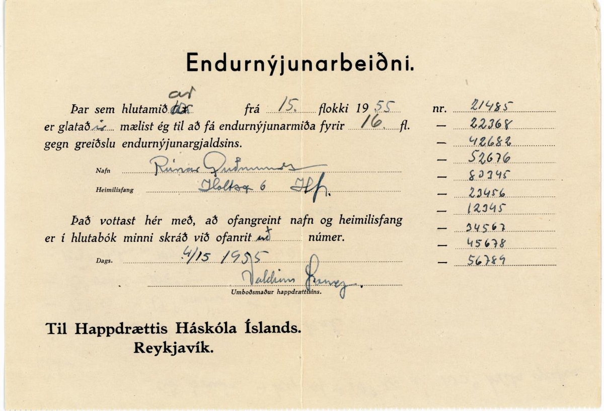 Endurnýjunarbeiðin fyrir hlutamiða frá 15. flokk 1955, sem hafa glatast en vilja fá endurnýjunarmiða fyrir 16. flokk fyrir greiðslu fyrir endurnýjun.