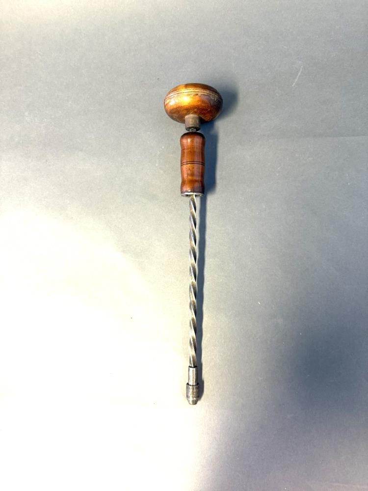 Handbor með renndum viðarhandföngum. Úr eigu Eyjólfs Sveinssonar á Gillastöðum.