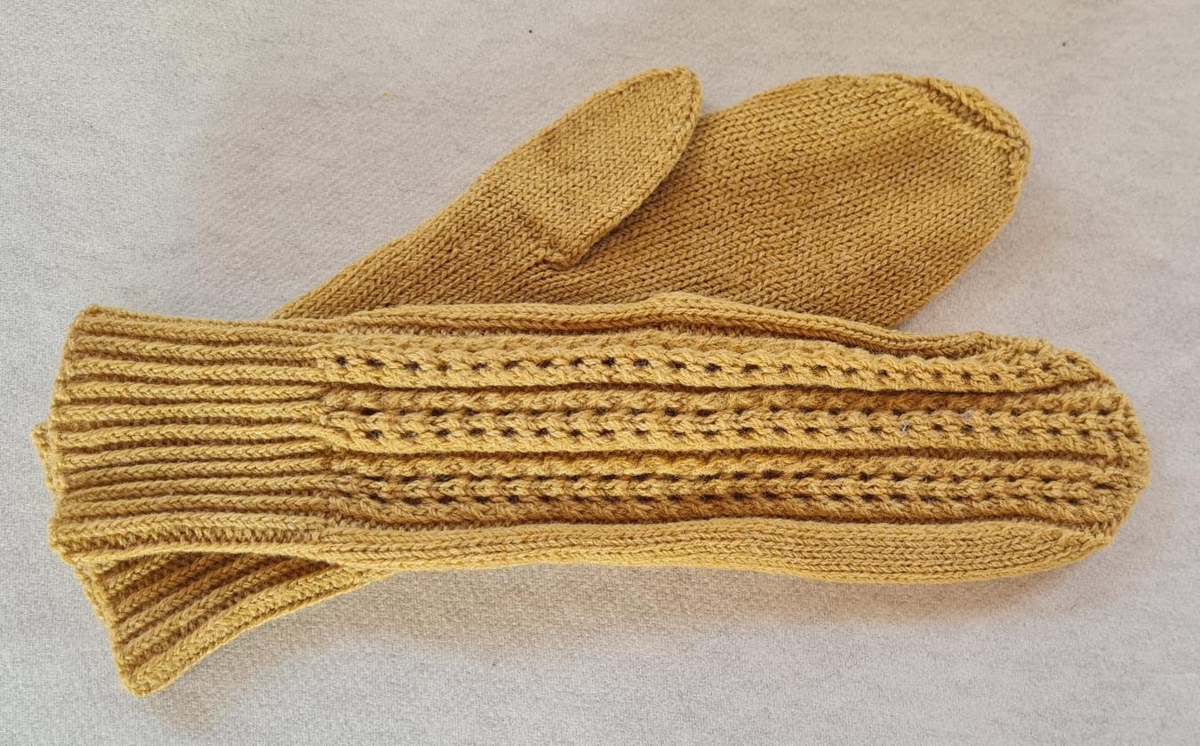 Kven- eða barnavettlingar, gulleitir með útprjóni á handarbökum. Eign og handverk Oddnýjar A Methúsalemsdóttur (1891-1983) frá Bustarfelli.Húsfreyja í Ytri-Hlíð Vopnafirði. Gefandi er dóttir hennar.