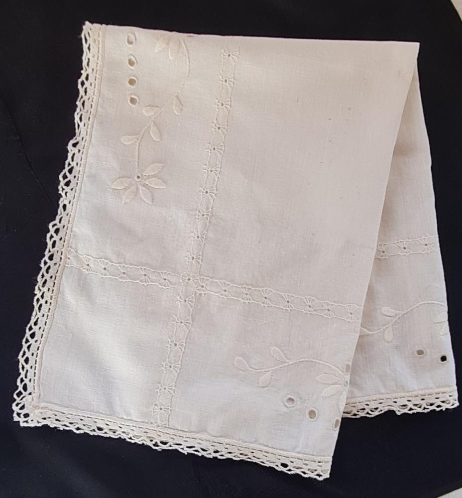 Bakkaservétta úr hvítu lérefti. Útsaumuð á öllum fjórum hliðum. Flatsaumur og franskur saumur. Eign og handverk Oddnýjar A Methúsalemsdóttur (1891-1983) húsfreyju Ytri-Hlíð Vopnafirði. Gefandi er dóttir hennar.