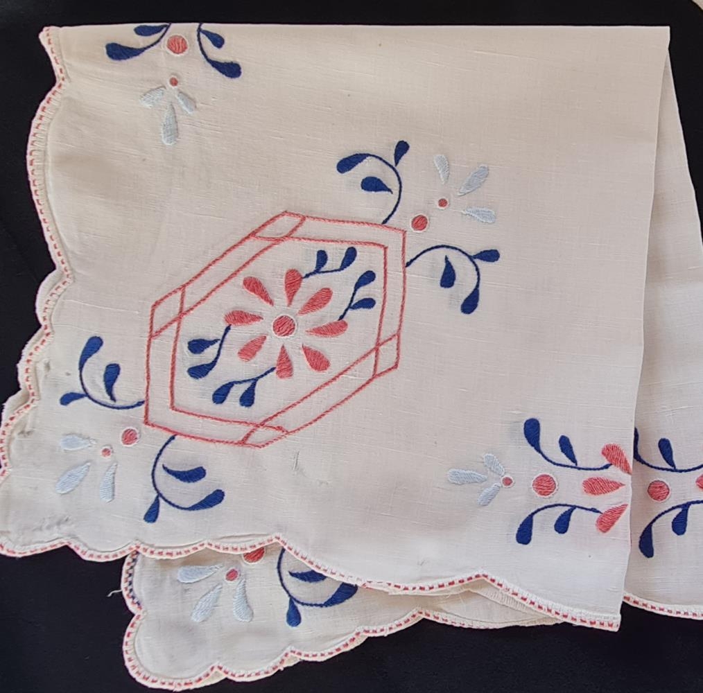 Ljósadúkur úr hvítu lérefti. Útsaumur í ljósbláum, dökkbláum og bleikum lit. Flatsaumur og kontorstingur. Kappmellað utan um og litirnir dregnir í. Eign og handverk Oddnýjar A Methúsalemsdóttur (1891-1983) húsfreyju í Ytri-Hlíð Vopnafirði. Gefandi er dóttir hennar.