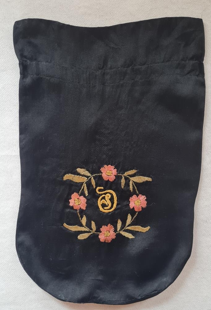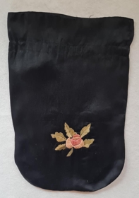 Svartur handavinnupoki. Útsaumur; flatsaumur, franskur saumur og fræhnútur. Á annari hlið pokans er bleik rós og laufblöð en á hinni er hringur af laufblöðum og fjórum bleikum blómum. Í miðju hringsins eru stafirnir OS. Pokinn var í eigu Oddnýjar A Methúsalemsdóttur (1891-1983) húsfreyju í Ytri-Hlíð Vopnafirði en stafirnir benda til þess að systir hennar Oddný Salína (1884-1931) hafi upphaflega átt hann.Gefandi er Valgerður dóttir Oddnýjar í YtriHlíð.