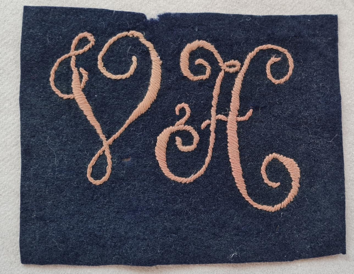 Hluti af söðulsessu í bláum lit Stafirnir VH eru saumaðir í klæðisbútinn með gulum/gylltum þræði. Eign og handverk Guðfinnu Valgerðar Helgadóttur (1869-1949 húsfreyju í Ytri-Hlíð Vopnafirði. Gefandi er sonardóttir hennar.