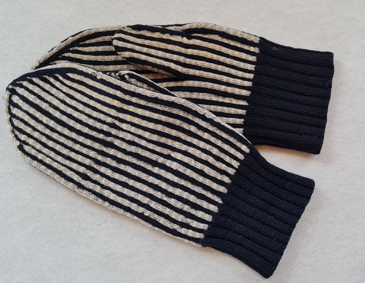 Ullarvettlingar. Svart- og ljósgráröndóttir með örlitlu ljósgulu í gráa litnum. Snúningar svartir. Voru sparivettlingar Helga Friðriks Sigurjónssonar (1897-1987) hreppstjóra og bónda í Ytri-Hlíð Vopnafirði. Að öllum líkindum prjónaðir af Vilhjálmi Sigfússyni (1904-2003) sem lengst af var til heimilis að Ytri Hlíð og vann þar þremur kynslóðum.