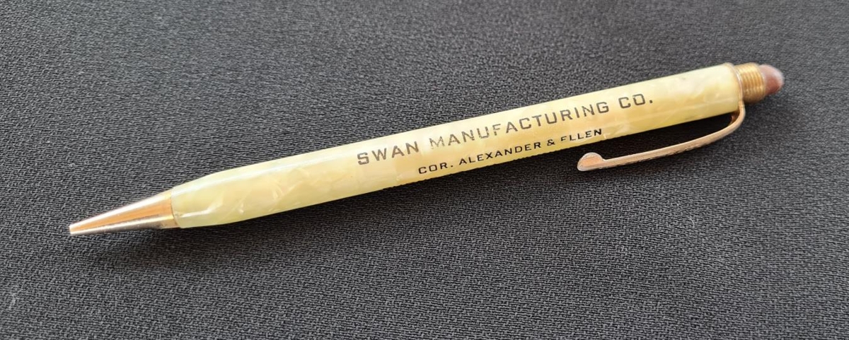 Gylltur og ljósgrænn blýantspenni merktur SWAN MANUFACTURING ásamt símanúmeri í Winnepeg. Halldór Methúsalemsson frá Bustarfelli (1882-1959) bjó í Winnepeg og átti þar verksmiðju með þessu nafni. Þar vestra hét hann Halldór M Swan. Oddný og Friðrik í Ytri-Hlíð, þ.e. systir hans og mágur hafa trúlega fengið pennann að gjöf frá Halldóri. Gefandi er dóttir Friðriks og Oddnýjar.