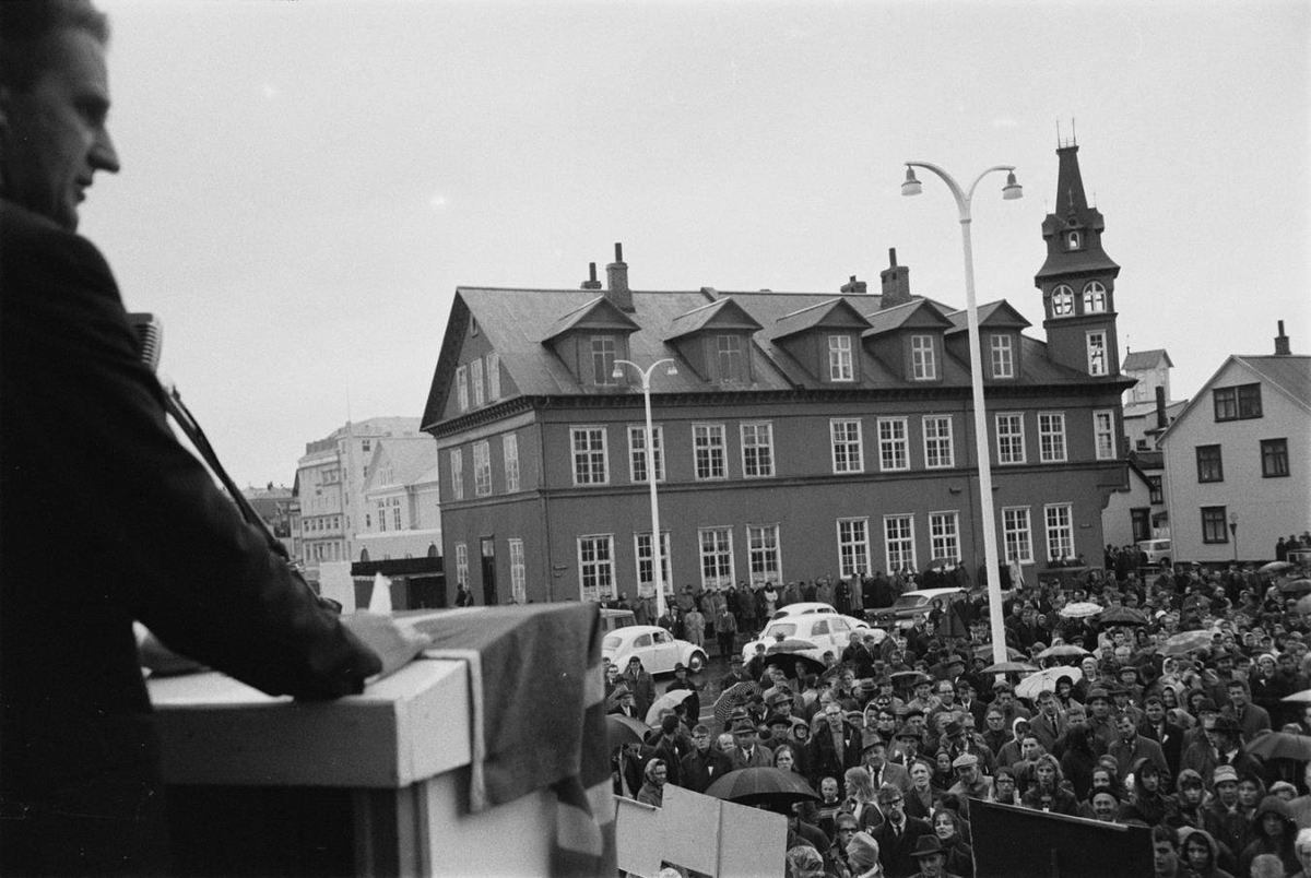 Mannfjöldi á útifundi við Miðbæjarskólann, Jónas Árnason setur fundinn.