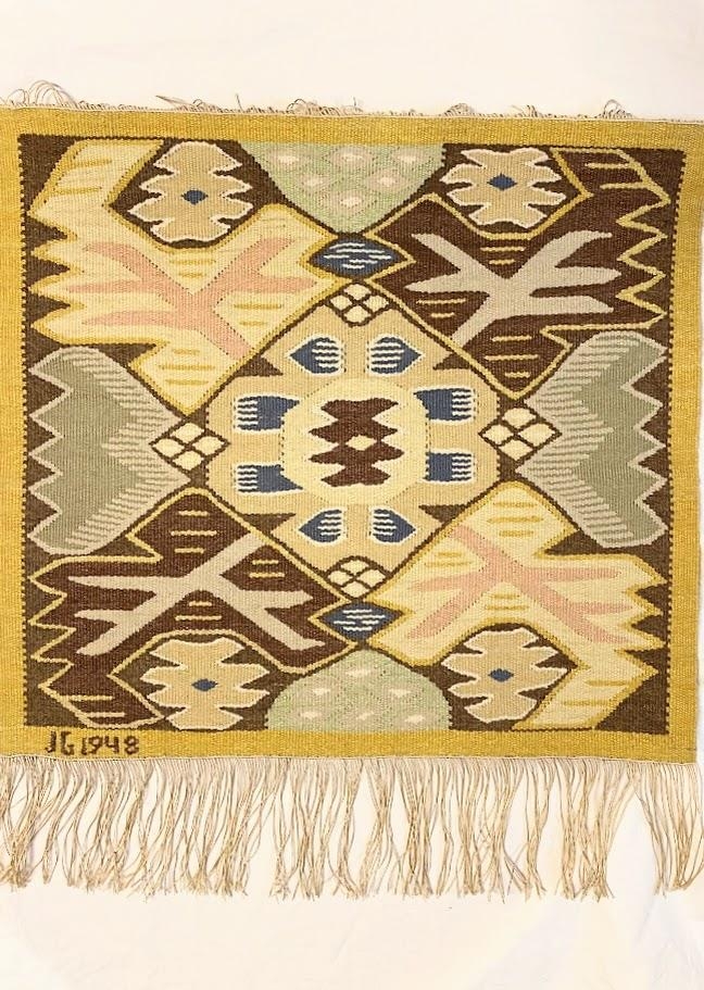 Myndvefnaður, sjávargróður , sem var prófstykki Jakobínu í Svíþjóð ári 1948. Handbrugðið. Uppistaðan hör, ívaf ullargarn sem var spunnið fyrir handvefnað, margir litir, 2 gráir, brúnn, gulur, blár og hvítur.
