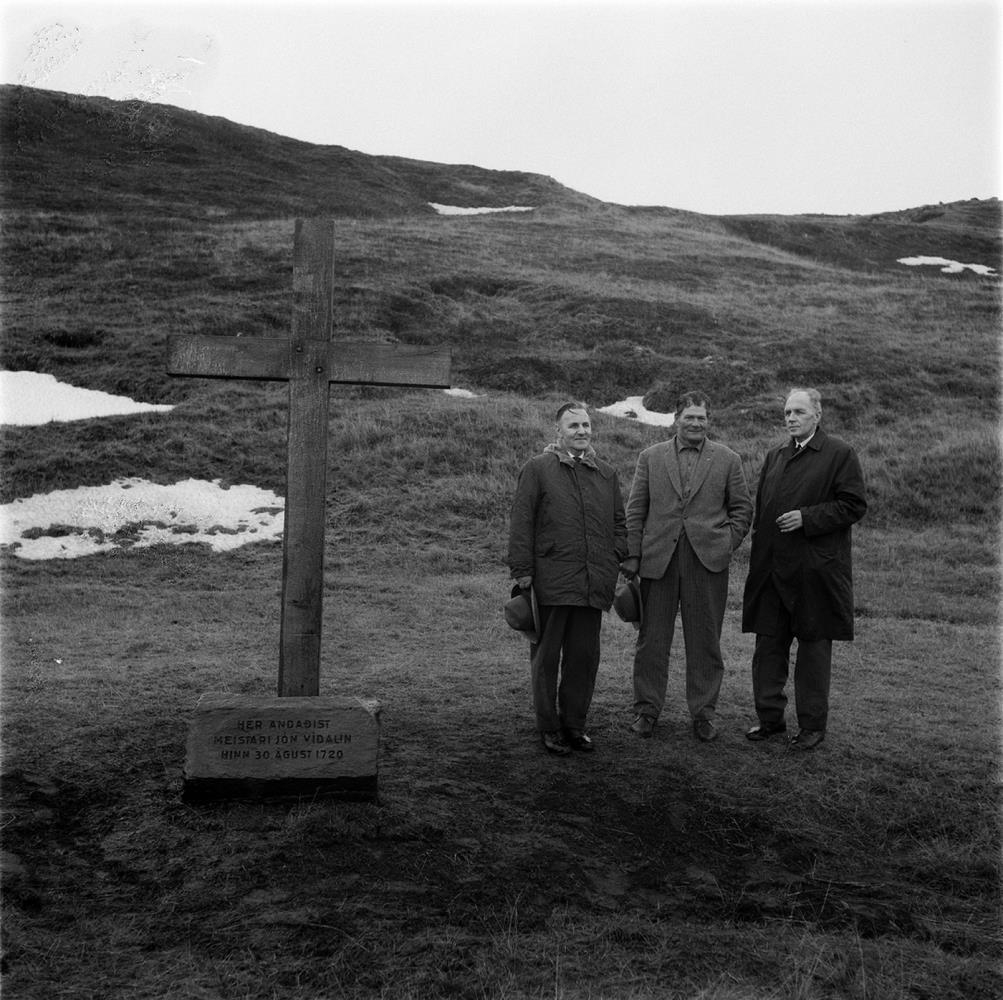 „Minnismerki um Jón Vídalín Skálholtsbiskup. Frá vinstri: Jón Sigmundsson (1893-1982), Ingi Guðmonsson (1902-1992) bátasmiður og séra Jón M. Guðjónsson (1905-1994). Minnismerki um Jón Vídalín Skálholtsbiskup (1666-1720) reist á dánarstað hans í Biskupsbrekku við Hallbjarnarvörður á Kaldadal 8. okt. 1963. Ingi Guðmonsson smíðaði krossinn. Sjá mynd á Ljósmyndasafni Akraness nr 29221.“ (NÞÁ 2025)