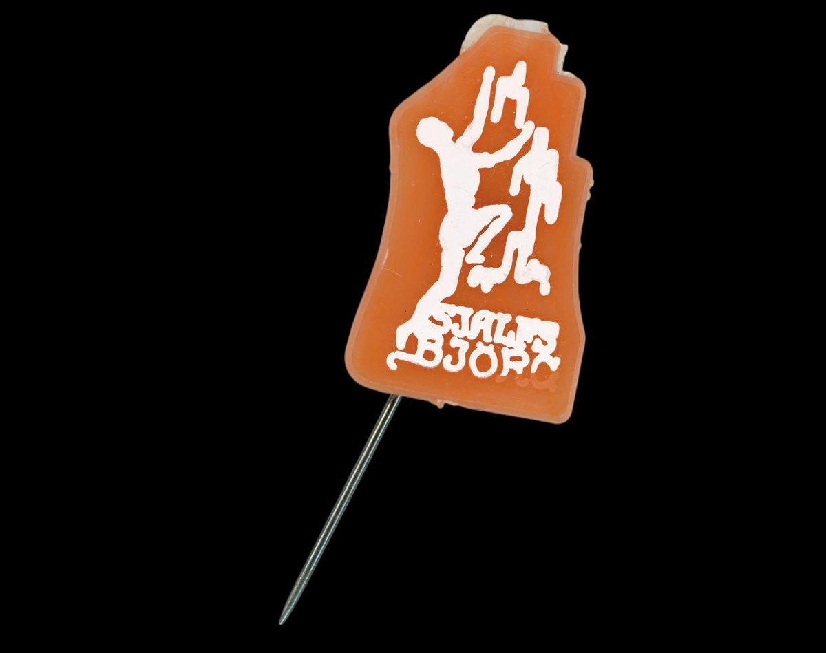 Barmmerki Sjáfsbjargar, appelsínugult í grunninn og hvítu upphelyptu letri og lógó.