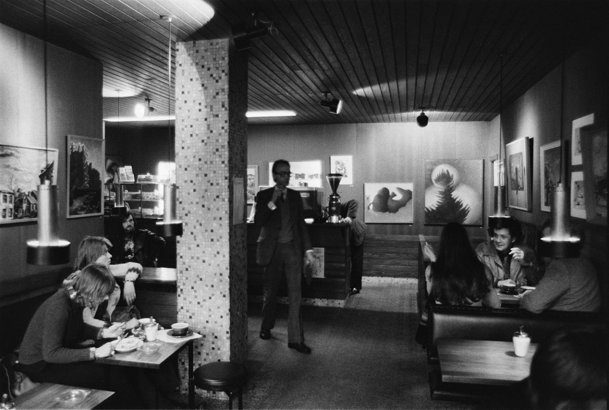 Mokka kaffihús, fólk að fá sér kaffi og myndir eftir Gunnar Geir Kristinsson á veggjum. Á myndinni má sjá Sigfús Daðason rithöfund og Erling Gíslason leikara.