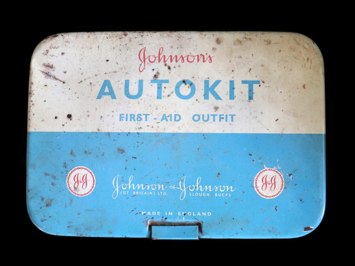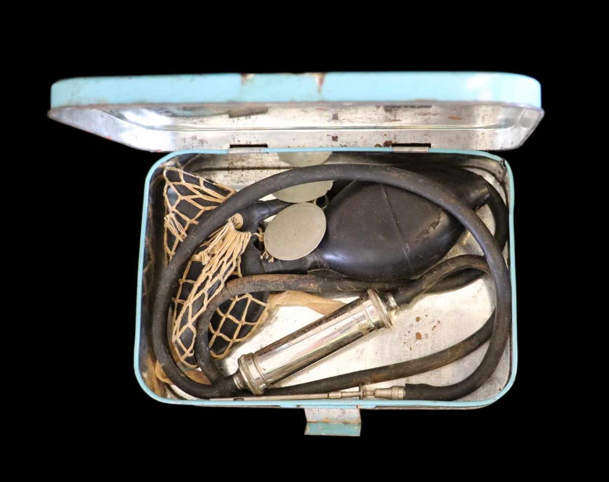 Doðadæla: Svört slanga með belgjum á öðrum enda og nál á hinum. Til dýralækninga (doða í mjólkurkúm). Geymt í bláu og hvítu járnboxi. “Johnson´s Autokit. First Aid Outfit.”