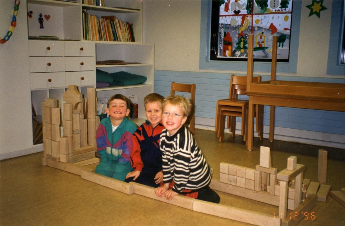 Ungir drengir á leikskólanum Gefnarborg í Garði í leik og starfi. Frá vinstri: Tómas Njálsson, Róbert Örn Ólafsson og Viktor Gíslason. Myndin er úr ljósmyndasafni sem Hafrún Ólöf Víglundsdóttir fyrrum leikskólastjóri Gefnarborgar afhenti byggðasafninu árið 2024. Myndasafnið er frá árunum 1976 til ársins 2000.