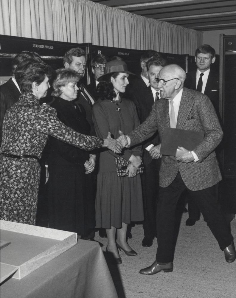 Halldór Laxness afhendir Seðlabanka Íslands og Þjóðminjasafns Íslands, Nóbelsverðlaunin og heiðursskjöl til varðveislu árið 1985.