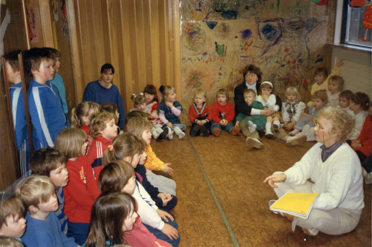 Helga Sigurðardóttir fyrrum kennari í Gerðaskóla er hér með fræðslu fyrir börnin á leikskólanum Gefnarborg í Garði. Myndin er úr ljósmyndasafni sem Hafrún Ólöf Víglundsdóttir fyrrum leikskólastjóri Gefnarborgar afhenti byggðasafninu árið 2024. Myndasafnið er frá árunum 1976 til ársins 2000.