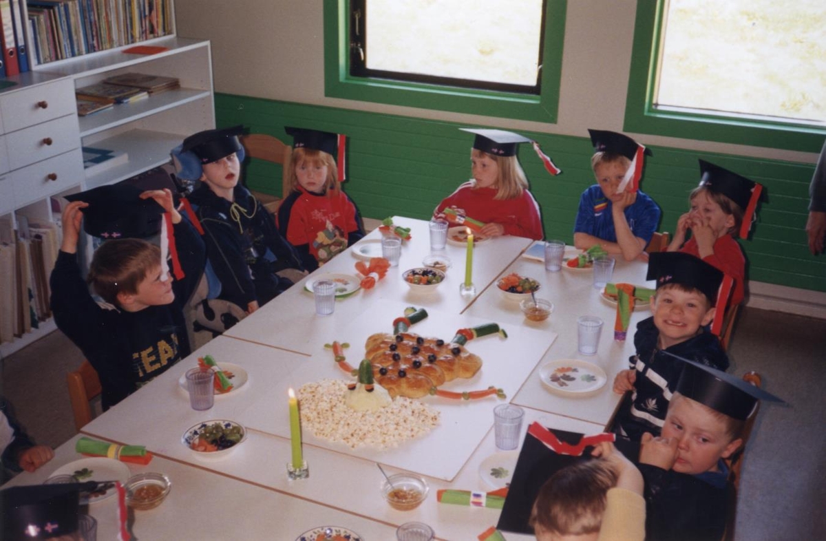 Útskriftarveisla barna á leikskólanum Gefnarborg í Garði árið 1997. Myndin er úr ljósmyndasafni sem Hafrún Ólöf Víglundsdóttir fyrrum leikskólastjóri Gefnarborgar afhenti byggðasafninu árið 2024. Myndasafnið er frá árunum 1976 til ársins 2000.
