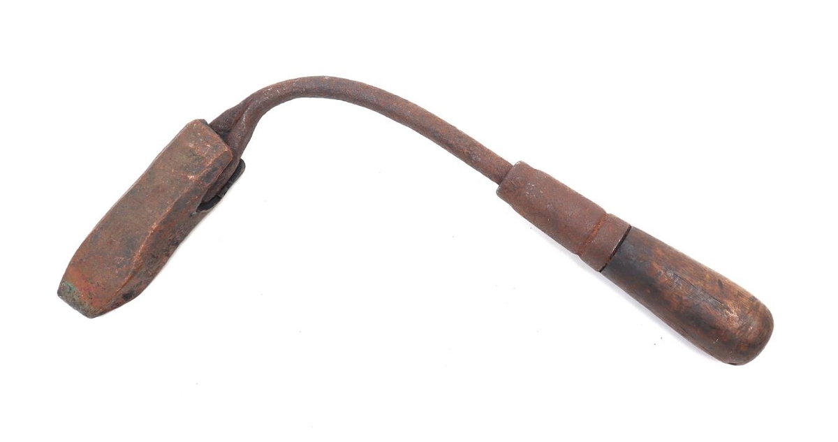 Heimsmíðaður, stór og klossaður lóðbolti með tréskafti og eins og "L" í laginu. Hann hefur verið hitaður upp með blússlampa eða á eldi og líklegast notaður við viðgerðir á vatnskössum eða bensíntönkum.