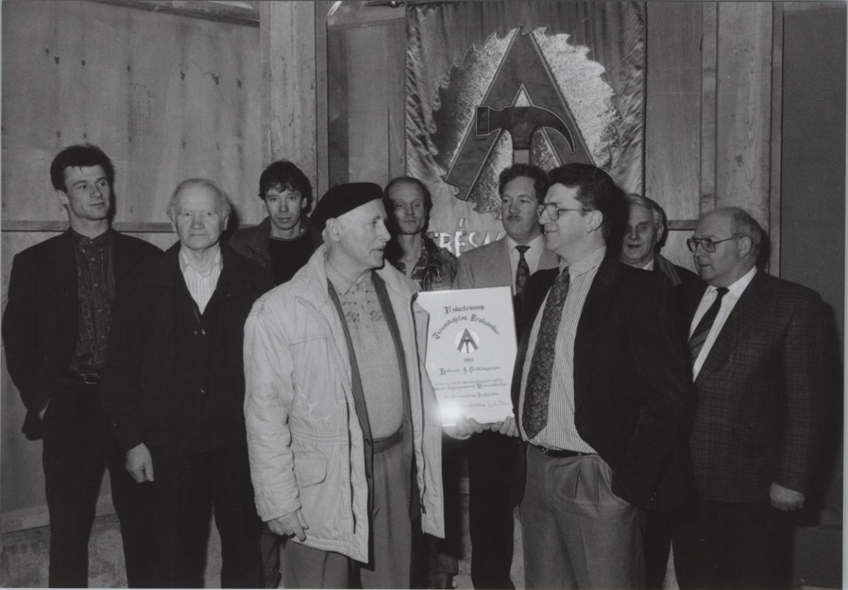 Trésmiðafélag Reykjavíkur afhendir viðurkenningu fyrir aðbúnað á vinnustað. Hallvarður Guðlaugsson tekur við viðurkenningarskjali úr hendi Halldórs Jónssonar hjá TR