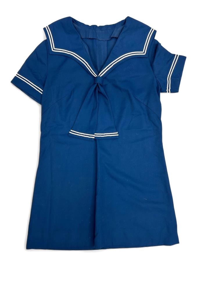 Fermingarkjóll Herborgar, dökkblár matrósakjóll með stuttum ermum, heimasaumaður.