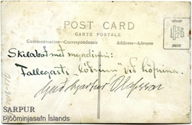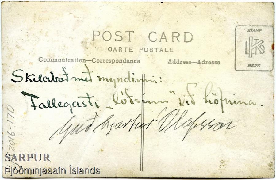 Karlmaður með einkennishúfu og síðum leðurfrakka stendur á hafnarbakka. Pakkhús í baksýn. Á bakhlið er skrifað: Skilaboð með myndinni: Fallegasti „lóðsinn“ við höfnina. Guðbjartur Ólafsson.