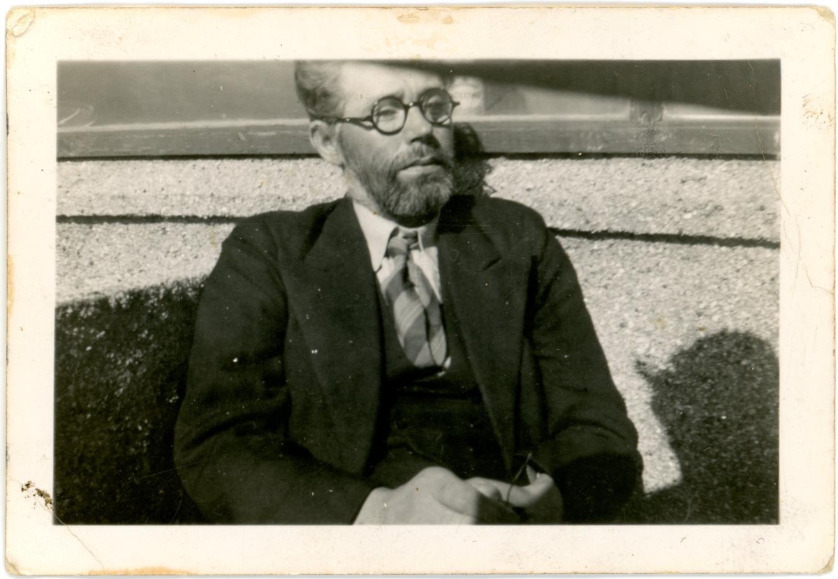Skúli Guðjónsson bóndi og rithöfundur á Ljótunnarstöðum í Hrútafirði. Situr á svölum íbúðar á Skúlagötu 58 í Reykjavík.