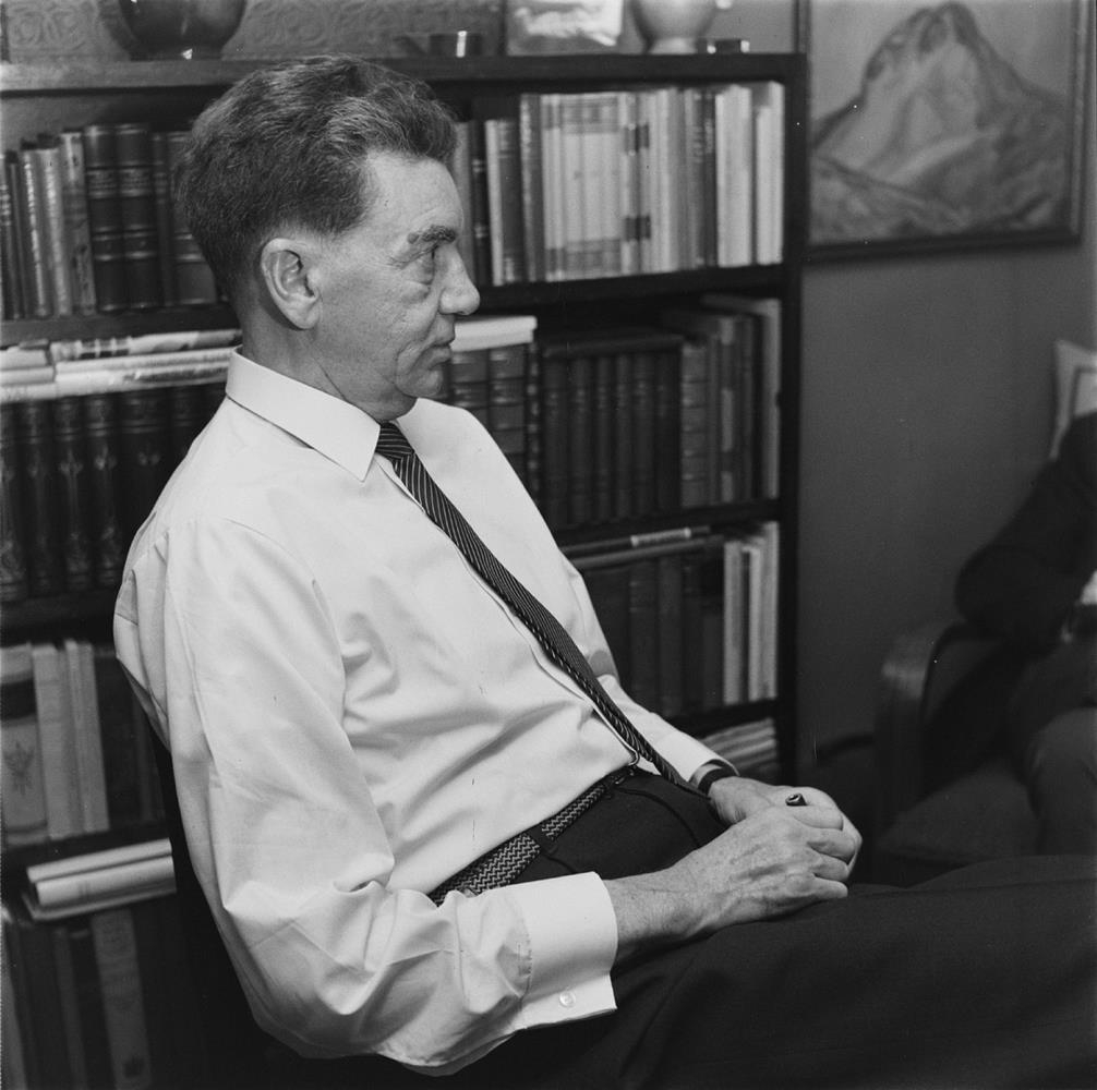 Snorri Hjartarsson skáld, situr í stól við bókahillu.