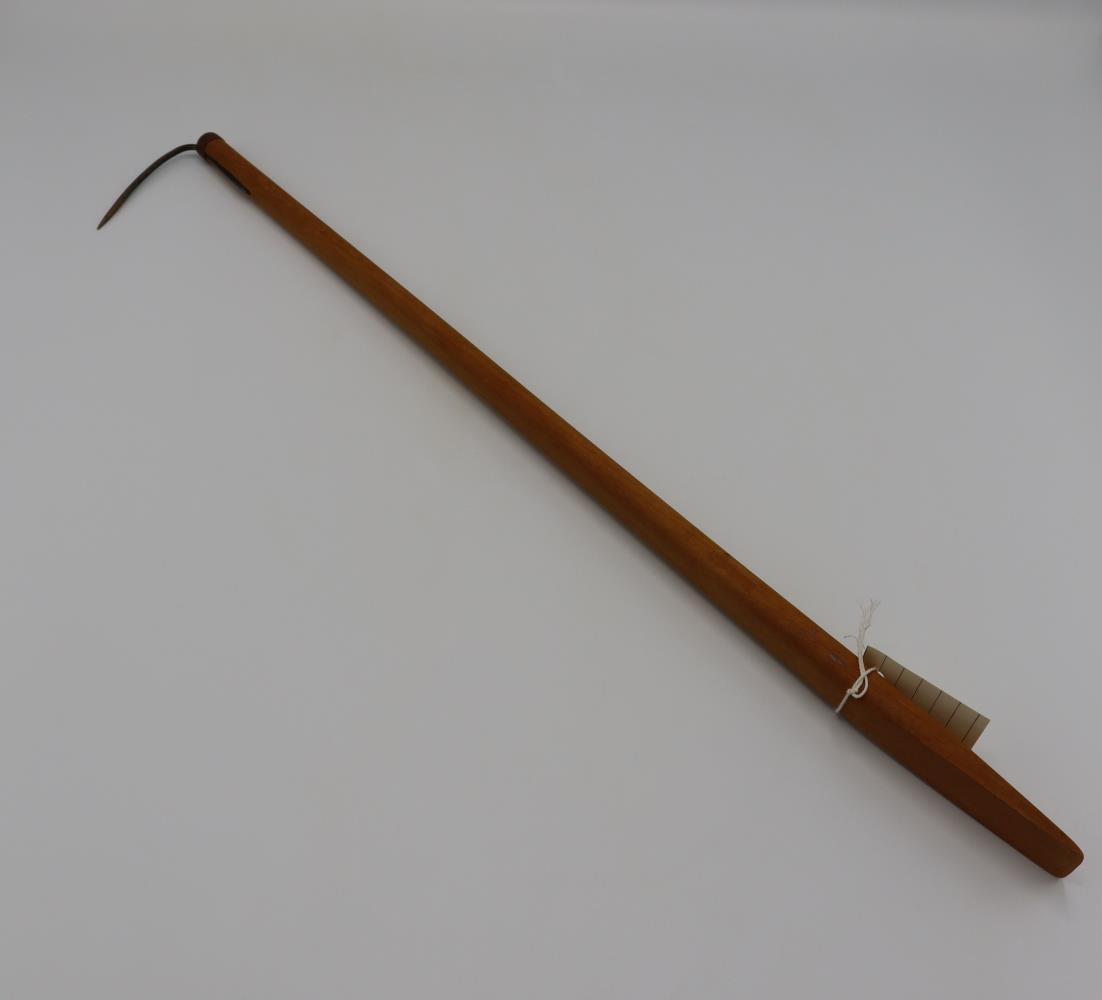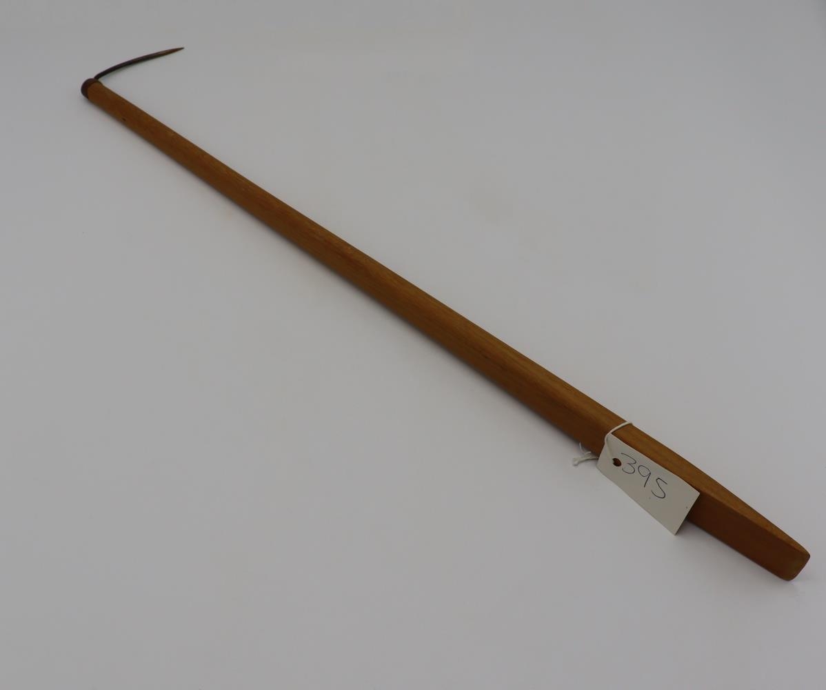 "395. Langgrefill. Áður en farið var að veiða lunda í háf í Vestmannaeyjabyggð, eða til ársins 1876 (en fyrsti háfurinn var keyptur til Eyja árið 1875), var lundinn veiddur með netum eða kræktur út úr holum með einskonar gogg. Þessir lundagoggar voru af tveim gerðum, lengri gerð og styttri gerð, og kallaðir greflar. Það orð er myndað af sagnorðinu að grafa. Á öðrum enda skaftsins var myndaður spaði. Með honum var lundaholan víkkuð og mold fjarlægð úr lundaholunni, svo að auðveldara yrði að ná til fuglsins þar. Stálgoggnum var krækt í fuglinn, ýmist í kvið hans eða brjóst, hann dreginn út og snúinn úr hálsliðnum. Þessi veiðiaðferð þótti með tíð og tíma svo ómannúðleg, að hún var bönnuð með héraðssamþykkt.Ólafur bátasmíðameistari Ástgeirsson frá Litlabæ smíðaði grefilinn og gaf hann Byggðarsafninu."