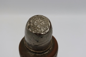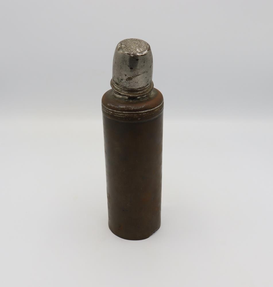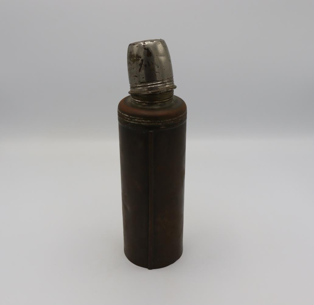 "780. Kaffibrúsi, ,,hitabrúsi” í látúnshylki, sem var smíðað í Vélsmiðju Th. Thomsen við Urðaveg um 1920. Kristján Ingimundarson, útgerðarmaður og formaður í Klöpp (nr. 16 við NjarðarstíI) lét smíða hylkið. Brúsa þennan notaði Kristján mörg sumur, þegar hann stundaði lundaveiðar í Heimakletti og Miðkletti, en hann var á sinni tíð einn af kunnustu fuglaveiðimönnum hér á sinni tíð og stundaði þær veiðar fram á níræðisaldur."