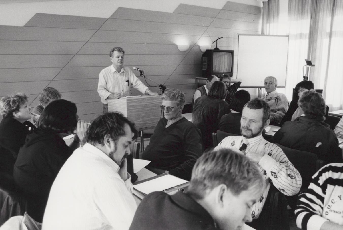 Frá fundi fiskvinnslufólks í Reykjavík laugardaginn 5. október 1991 - Snær Karlsson formaður Deildar fiskvinnslufólks í Verkamannasambandinu í ræðustól - mynd: Vinnan/Róbert
