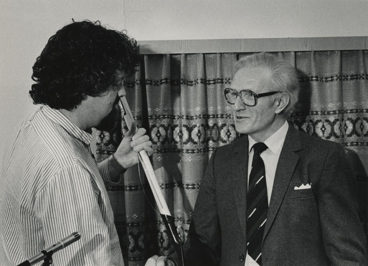 Menningar- og fræðslusamband alþýðu 15. feb.1985. Frá 10 ára afmælisvöku Félagsmálaskólans. Helgi Guðmundsson og Óli S. Runólfsson. ASÍ 205.