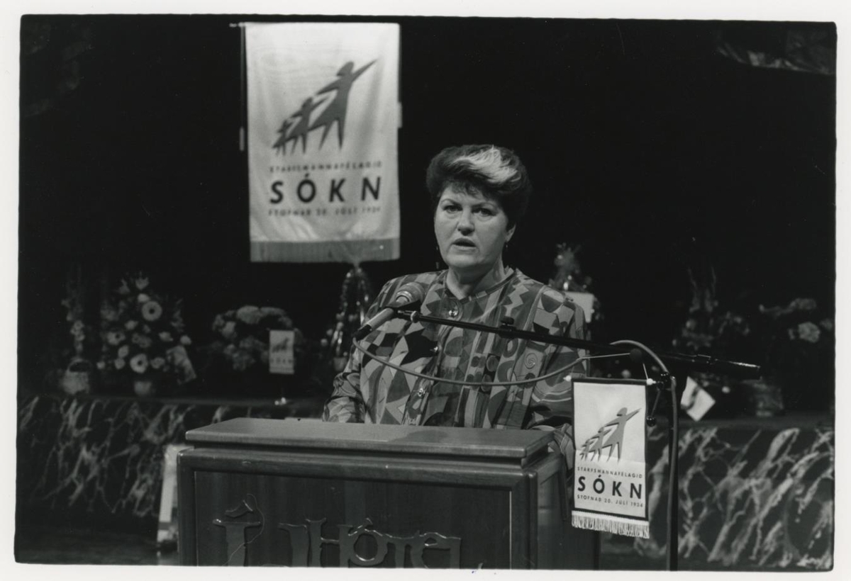 Þórunn Sveinbjörnsdóttir, formaður Sóknar á 60 ára afmælishátíð Sóknar. Vinnan 9.tbl nóv 1994. ASÍ 100.