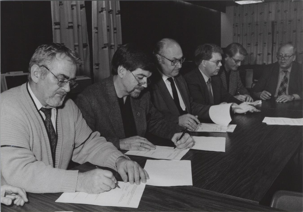 Frá undirritun fyrsta kjarasamnings Samiðnar. Samiðnaðarblaðið 1. tbl. mars 1995. Mynd: Róbert.