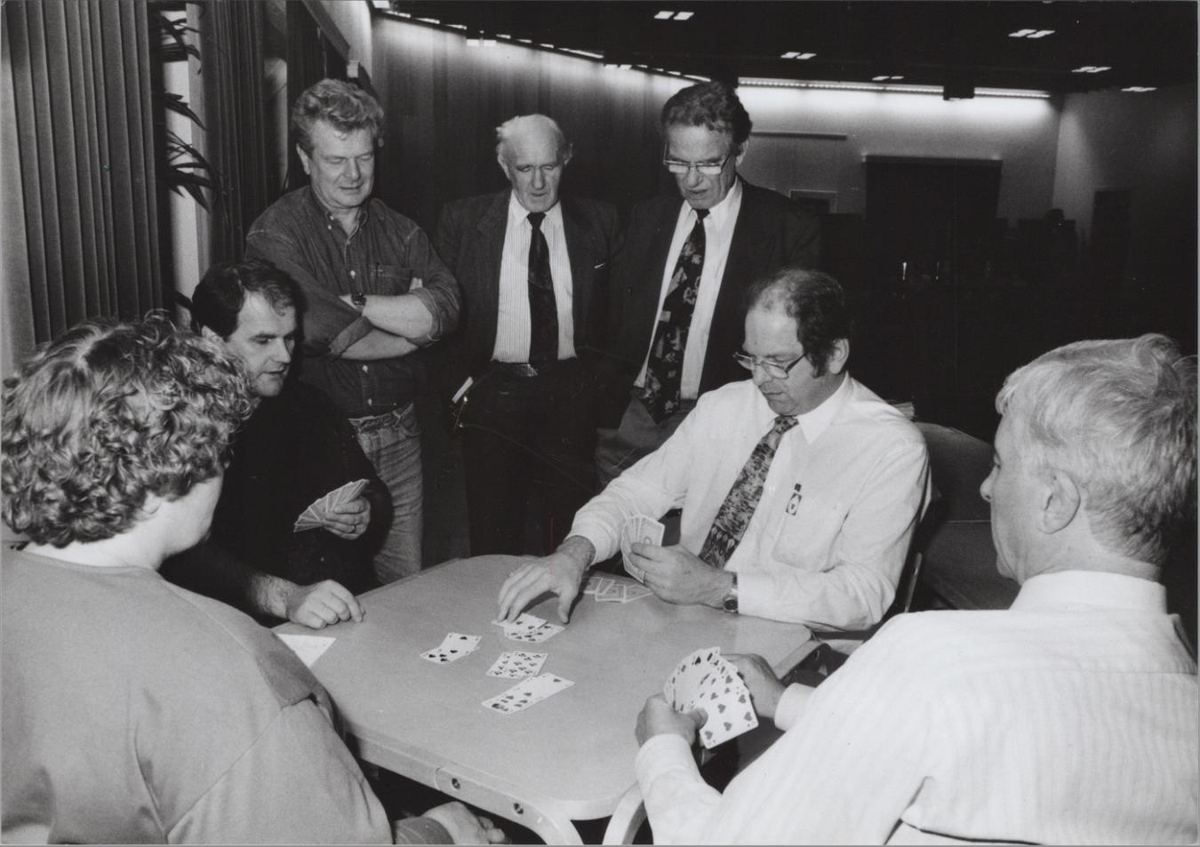 Beðið eftir svörum frá ríkisstjórninni haustið 1993, þegar kjarasamningar voru framlengdir. Frá vinstri: Björn Snæbjörnsson Akureyri, Snær Karlsson VMSÍ, Böðvar Pétursson VR, Magnús Geirsson RSÍ, Hrafnkell A. Jónsson Árvakri Eskifirði og Jón Karlsson Sauðárkróki. Mynd: Róbert/Vinnan.