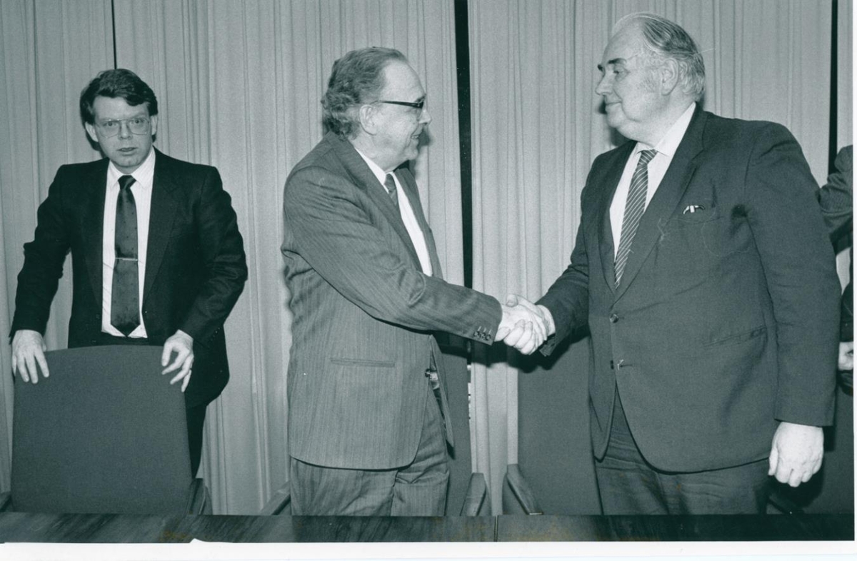 Frá samningafundi VMSÍ og VSÍ. Samningar - verkamannasambandið og VSÍ. Þórarinn V. Þórarinsson, ónafngreindur og Guðmundur J. Guðmundsson.
