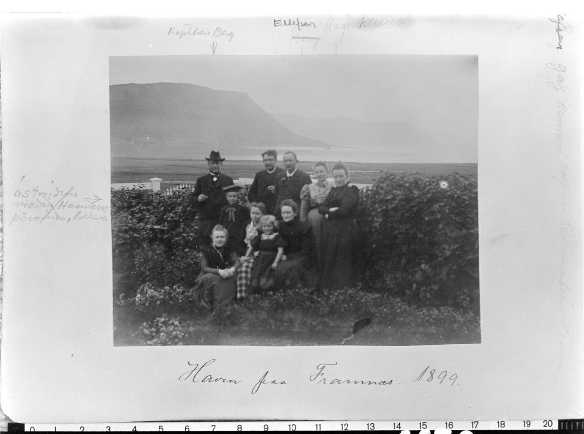Eftirtökur eftir ljósmyndum. Hópur fólks í húsagarði, runnar meðfram grindverki. Hannes Hafstein aftast f. miðju. Á spássíuna er skrifað: Kaptein Berg (karlmaðurinn með hattinn), Ellefsen, Ragnheiður. Undir er skrifað: Haven paa Framnes 1899.