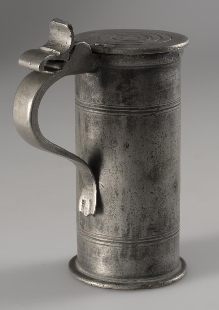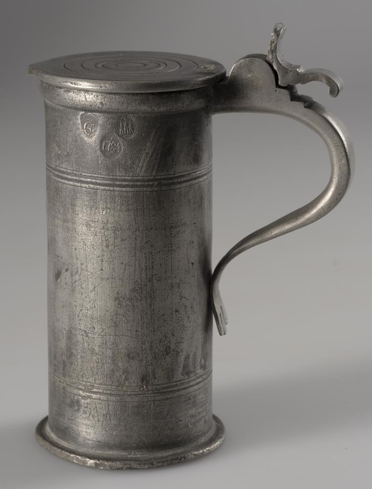 Um hana er hið sama að segja og tinfatið [Þjms. 2024-1-2], að hún er frá Svaðastöðum og hefur runnið þaðan að Hofstöðum til Unu ömmu minnar, en þaðan til móður minnar. Ártalið 1784 er í stimpli á tinkönnunni svo og Chr. 5., en hann var Danakonungur frá 1646-1699. Christján VII var hins vegar Danakonungur frá 1749-1808. Hvernig á þessu stendur veit ég ekki, nema kannan sé steypt í stíl frá tímum Chr. 5. Handfang og lok voru á könnunni, og hafa þau brotnað af, en hvenær það gerðist veit ég ekki. Kannan var eins og hún er núna, er ég man fyrst eftir mér. Hún var lengst af geymd upp á háalofti heima á Sauðárkróki.