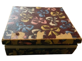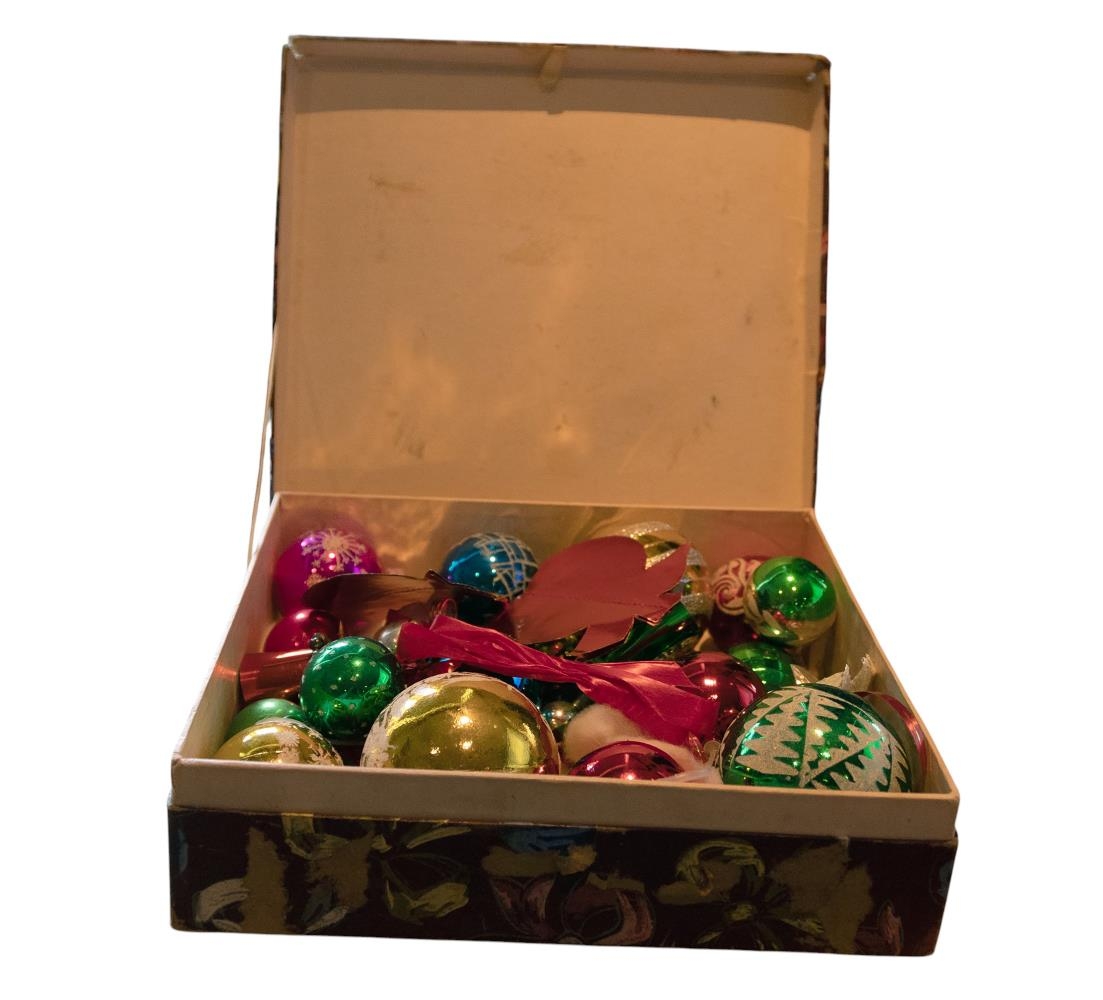 Jólakúlur og jólaskraut í vínrauðru pappaboxi frá ömmum gefanda.
