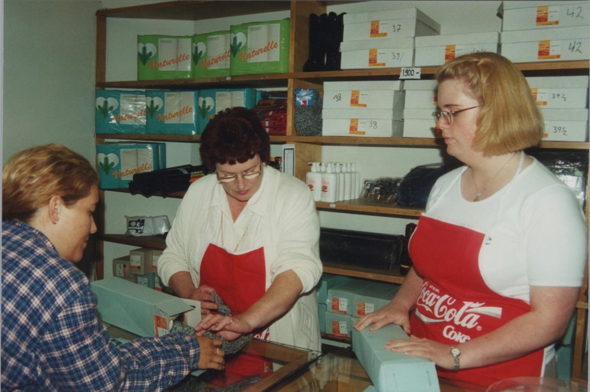 Tvær afgreiðslukonur og viðskiptavinur í verslun á Siglufirði, Rannveig Pálsdóttir og dóttir hennar Perla Fanndal.