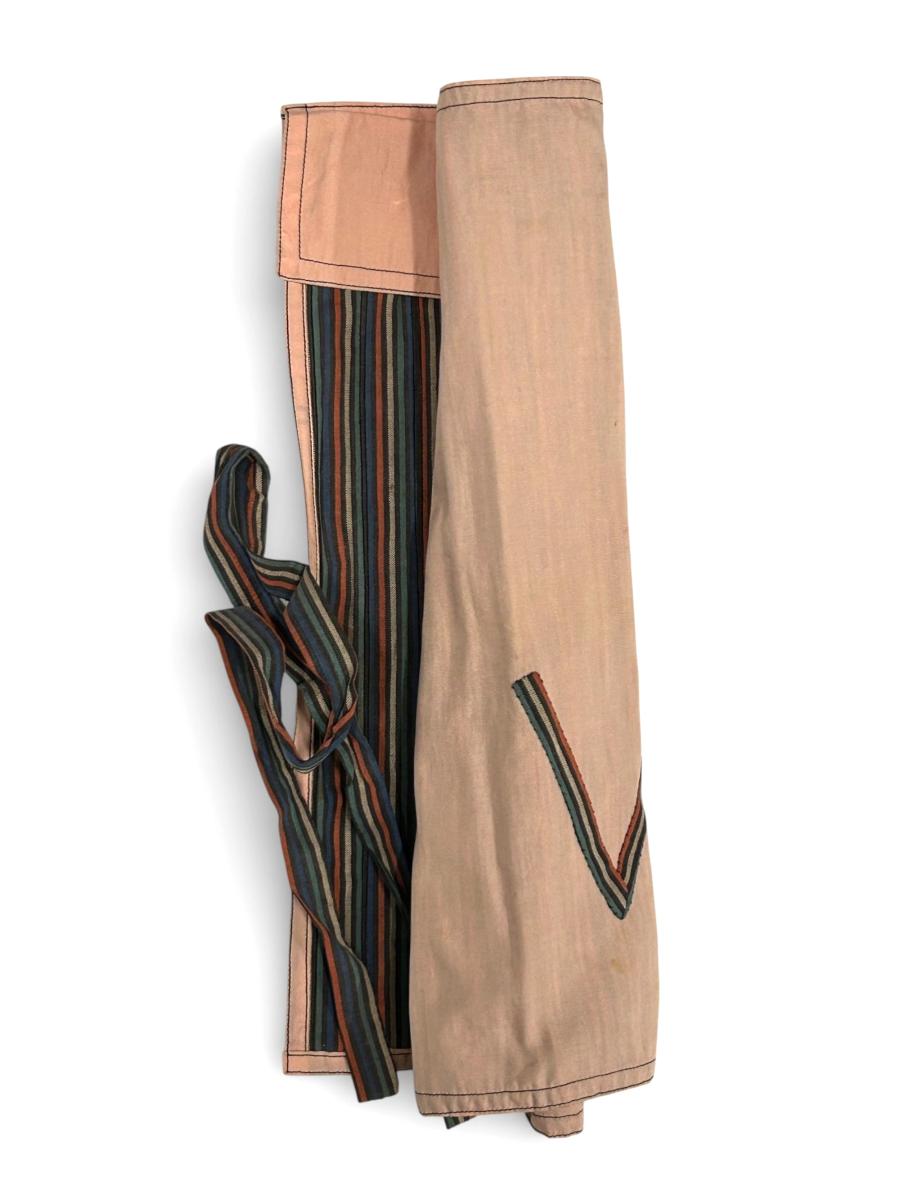 Vélsaumuð prjónageymsla. Fóðrað stykki sem er hólfað niður að innan til að geyma í prjóna. Fangamarkið VP er saumað á framhliðina, mjóar efnisræmur úr fóðurefninu mynda stafina. Stafirnir saumaðir niður í höndum. Prjónageymslan er bundin saman með bandi úr sama fóðurefni. Stærð: 40 x 38 sm.