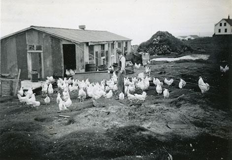 Hjónin á Brekku í Garði, Steinunn Sigurðardóttir og Vilhjálmur Halldórsson voru með hænsnabú við heimili þeirra á sínum tíma. Á myndinni er Vilhjálmur að sinna hænunum á búinu. Í baksýn má sjá æskuheimili Vilhjálms, Varir í Garði.